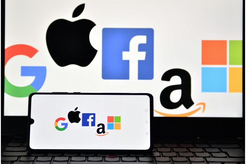 An illustration picture taken in London on December 18, 2020 shows the logos of Google, Apple, Facebook, Amazon and Microsoft displayed on a mobile phone and a laptop screen. - The European Union on December 15 unveiled tough draft rules targeting tech giants like Google, Amazon and Facebook, whose power Brussels sees as a threat to competition and even democracy.JUSTIN TALLIS/AFP VIA GETTY IMAGES