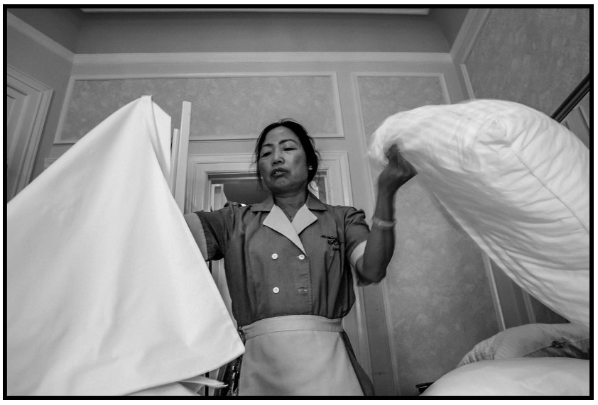 A housekeeper prepares a room at a San Francisco hotel in 2007. In nonunion hotels, workers put in hours loading their carts and performing other tasks, and are sometimes not paid for their time on such duties.