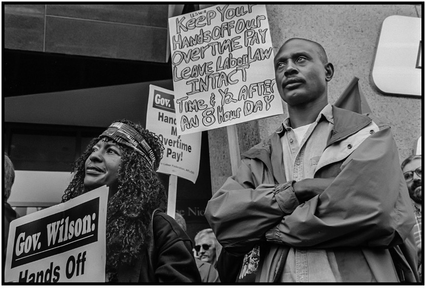 After then-Gov. Pete Wilson pushed to abolish overtime pay in 1997 for days of work longer than eight hours, people protested in front of the office of California’s Industrial Welfare Commission in San Francisco. The state body ultimately voted to go along with the governor.