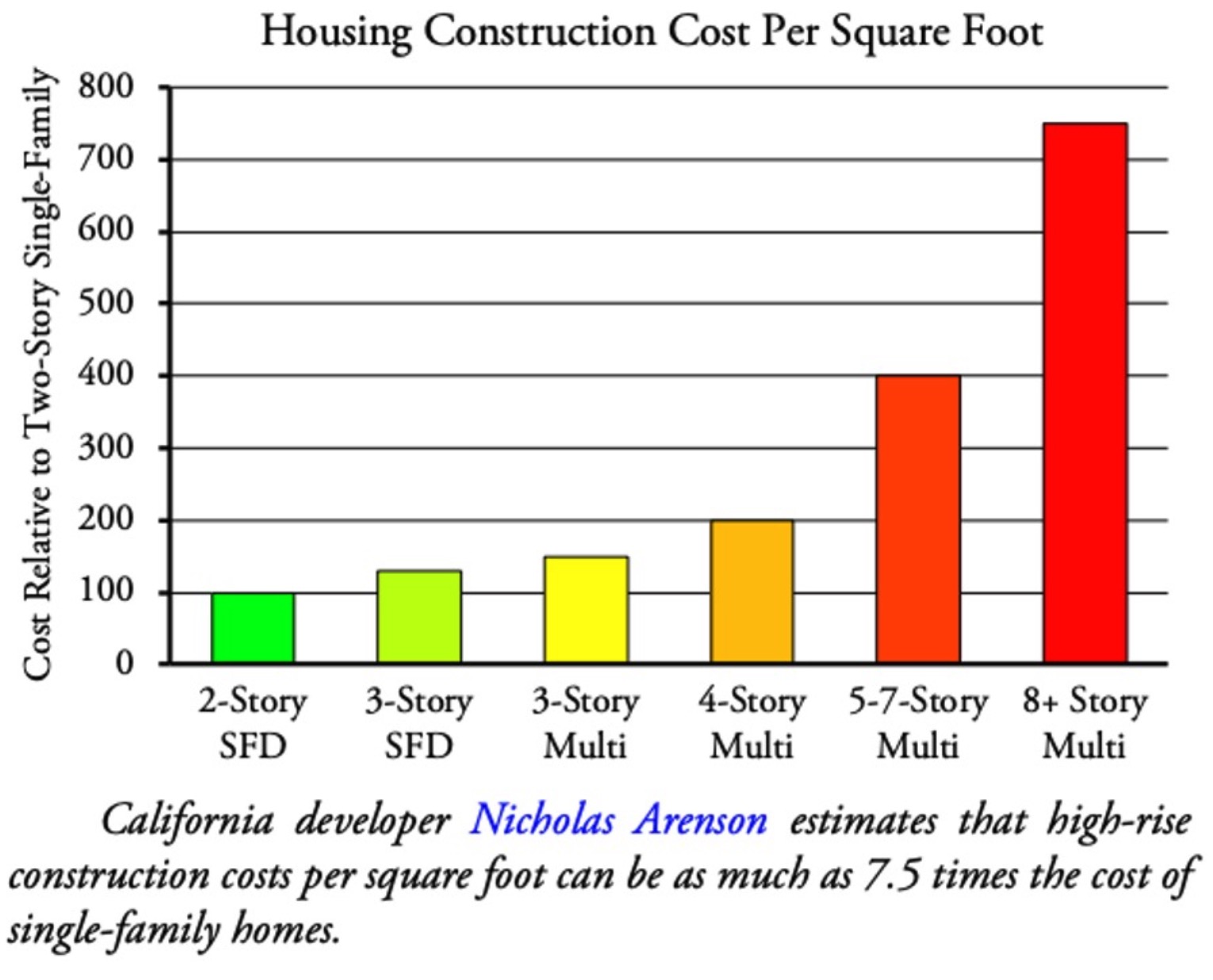 High-density-advocates claim that developers can overcome high land costs by building higher densities. However, the cost of high-density construction is significantly greater, per square foot, than low-density construction.