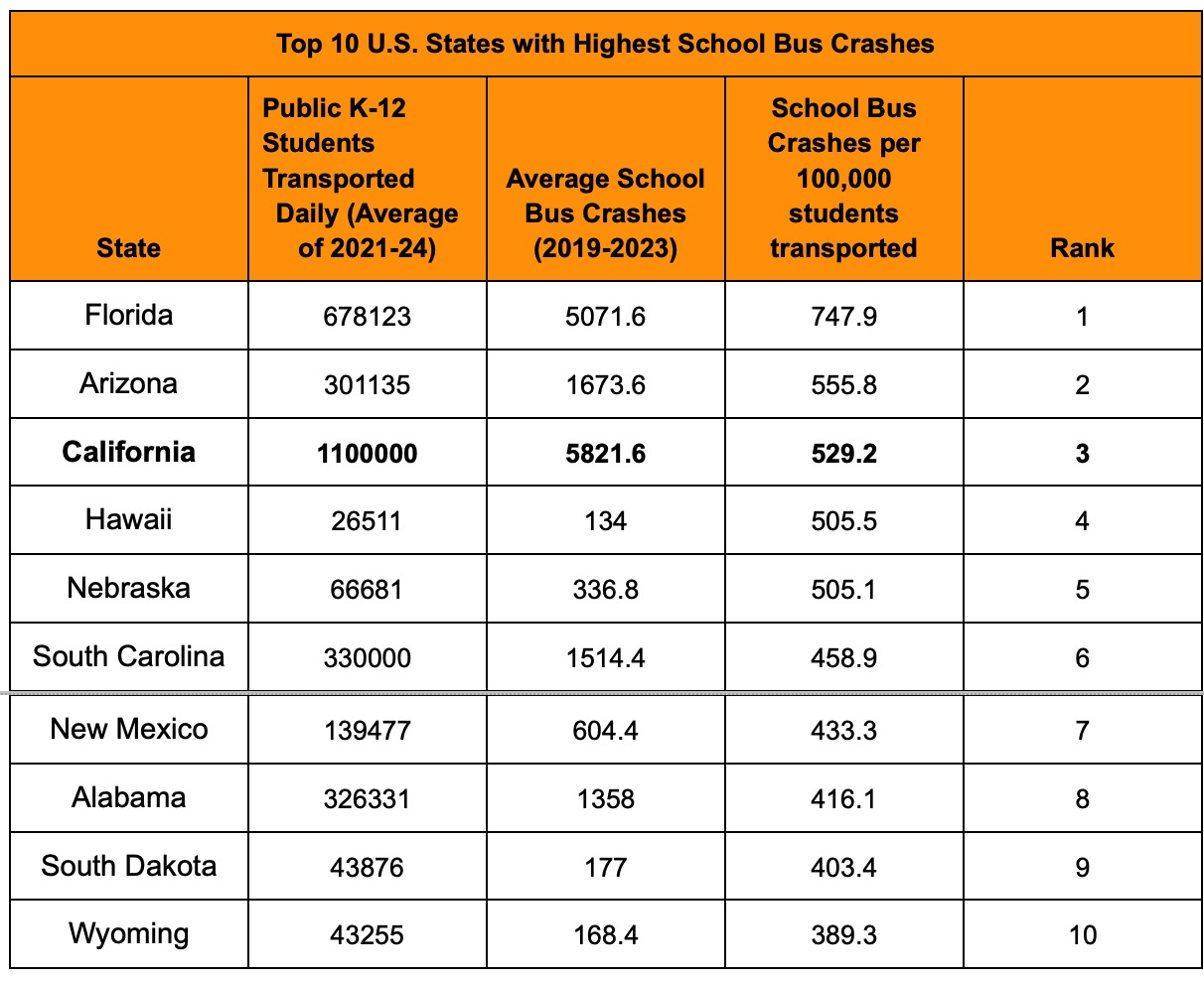"The data reveals that California reported the third highest school bus crash rates in the U.S.