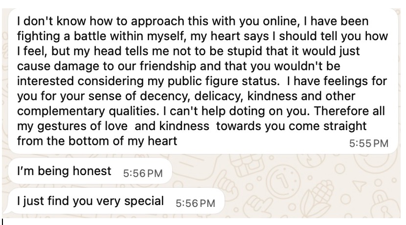 These scammers are the best at what they do. I, myself, was a bit naïve after spending some time away from social media. Despite my years as a contributor with Citywatchla.com, during which I spent a great deal of time researching fact over fiction for stories I delivered, it surprised me when I got sucked into a conversation (almost totally ChatGPT-written) consisting of beautiful words, promises, and verbiage I had never heard from any man. It was very easy to be duped, but there was always a “nagging” in my brain that stopped my heart from falling for a person solely based on typed words alone. This, sadly to say, was not my first encounter. For a while they were humorous to me and usually ended with a request for a management fee to deliver a celebrity or help to pay for a chartered aircraft for the same. I asked for audio and video calls, usually to no avail. These were all fakes: heaps of chat messages that were filled with empty promises, talk of love, travel plans and… oh, wait… pleas for money for one “emergency” or another. Insert any chat here.