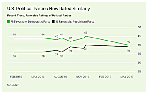 The party’s strategy can’t be counted a success on conventional measures; Gallup reports that the Dems have lost 5 approval points since November, leaving the two parties with near-identical approval ratings (D: 40%, R: 39%).