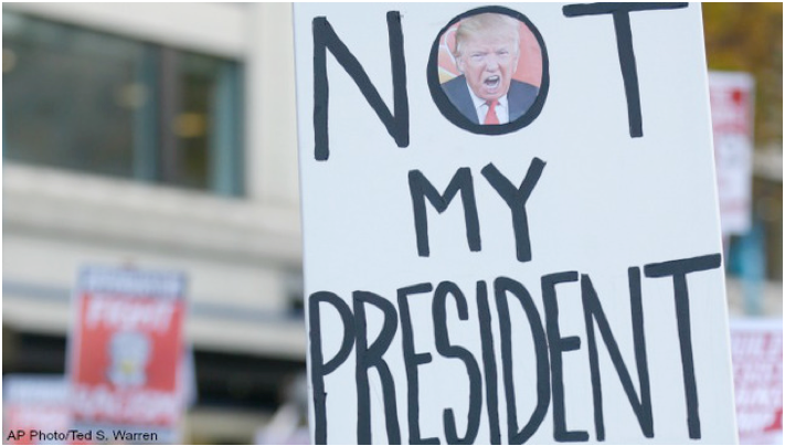 GUEST WORDS-High above, somewhere behind the black glass façade, President-elect Donald J. Trump was huddled with his inner circle, plotting just how they would “drain the swamp” and remake Washington, perhaps the world. On the street far below, inside a warren of metal fencing surrounded by hefty concrete barriers with “NYPD” emblazoned on them, two middle-aged women were engaged in a signage skirmish. One held aloft a battered poster that read “Love Trumps Hate”; just a few feet away, the other brandished a smaller slice of cardboard that said “Get Over It.” (Photo above: Security agents in front of Trump Tower, New York.)