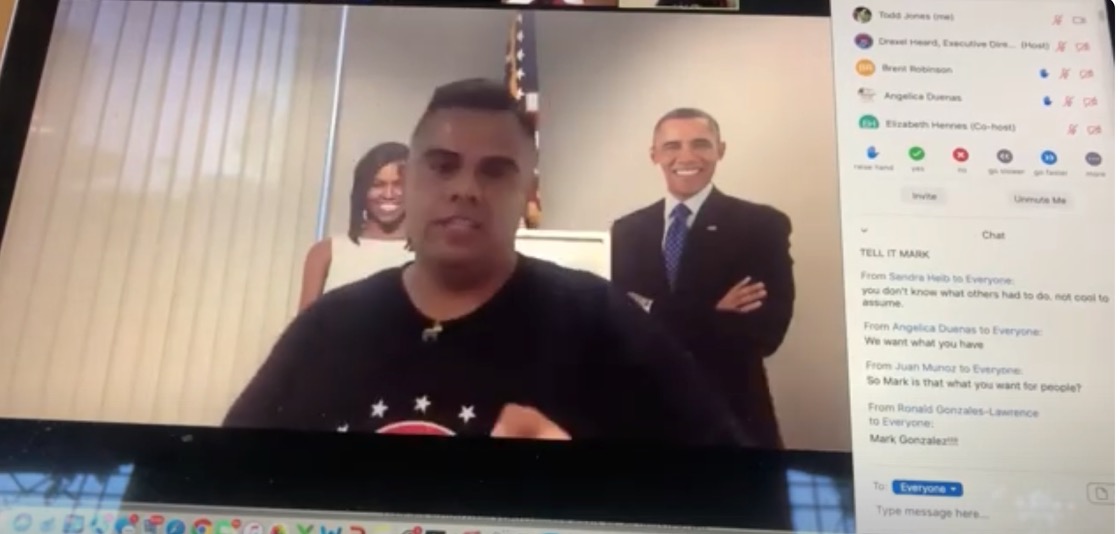 Mark Gonzalez making his LACDP Chair campaign speech; one member wrote “You don’t know what others had to do, not cool to assume.” Only for the first few meetings did he have the chatbox turned on. That stopped when members used the chat to voice their displeasure or call points of order, since they could not unmute themselves. (Photo from Youtube)