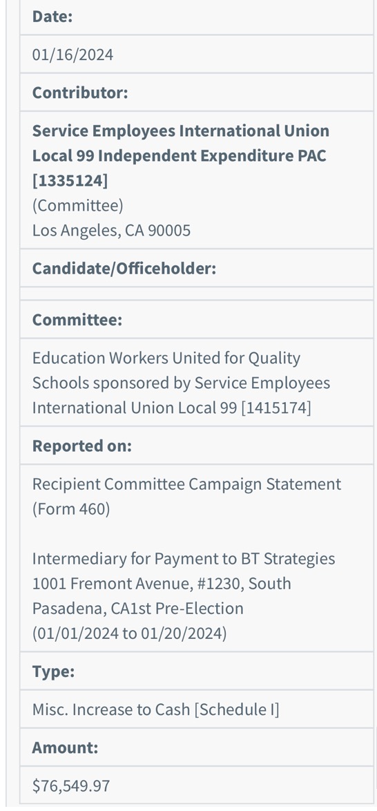 The tactic may bear the fingerprints of campaign consultant Javier Gonzalez of BT Strategies. According to official campaign disclosures, he received more than $75,000 in money through an independent expenditure campaign by SEIU Local 99 to promote Graciela Ortiz. (See images here; and find online the information shown in them.)