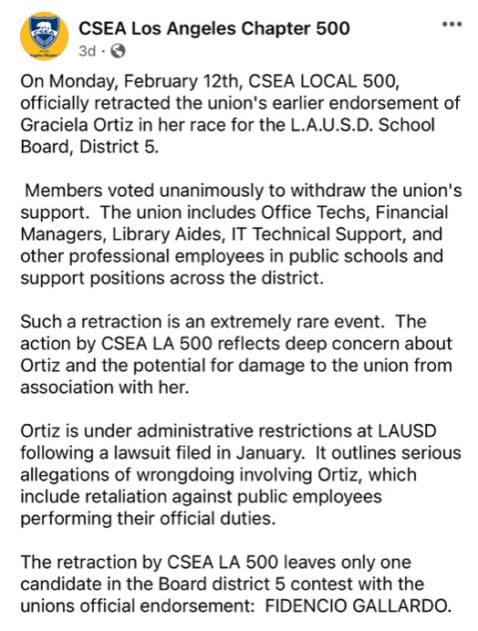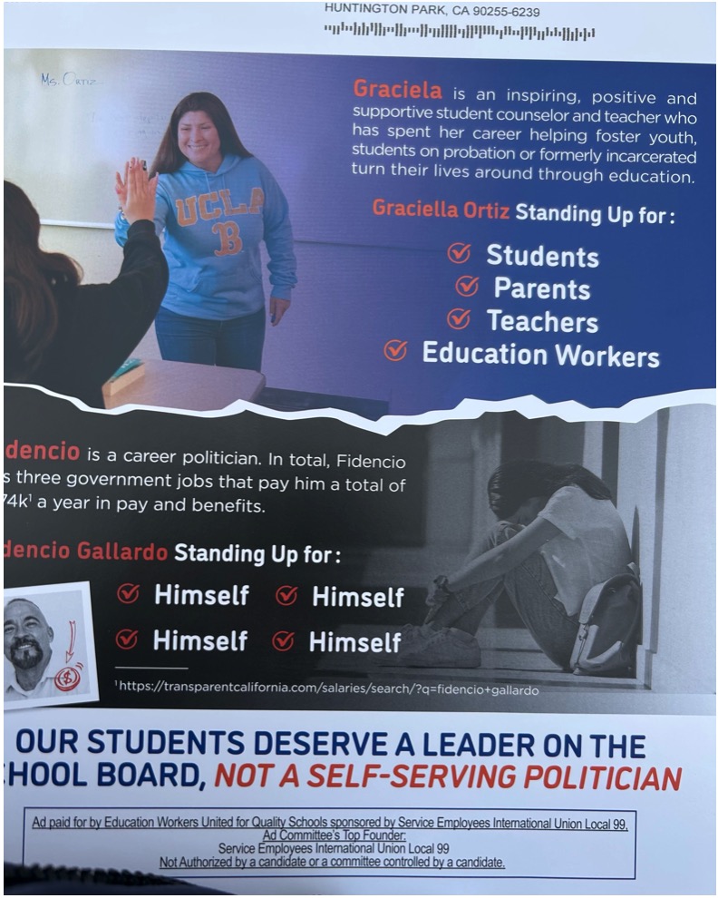 SEIU Local 99, which represents some school employees, paid for attack mailers in the contest for the open seat to succeed LAUSD School Board President Jackie Goldberg in District 5. The mailers, which began to arrive Feb. 16, lash out at 30-year teacher Fidencio Gallardo and promote Graciela Ortiz, a school employee recently removed from duty at LAUSD after being named in a shocking lawsuit alleging cover-up of sexual abuse of a student and retaliation against the police who nabbed the perpetrator.
