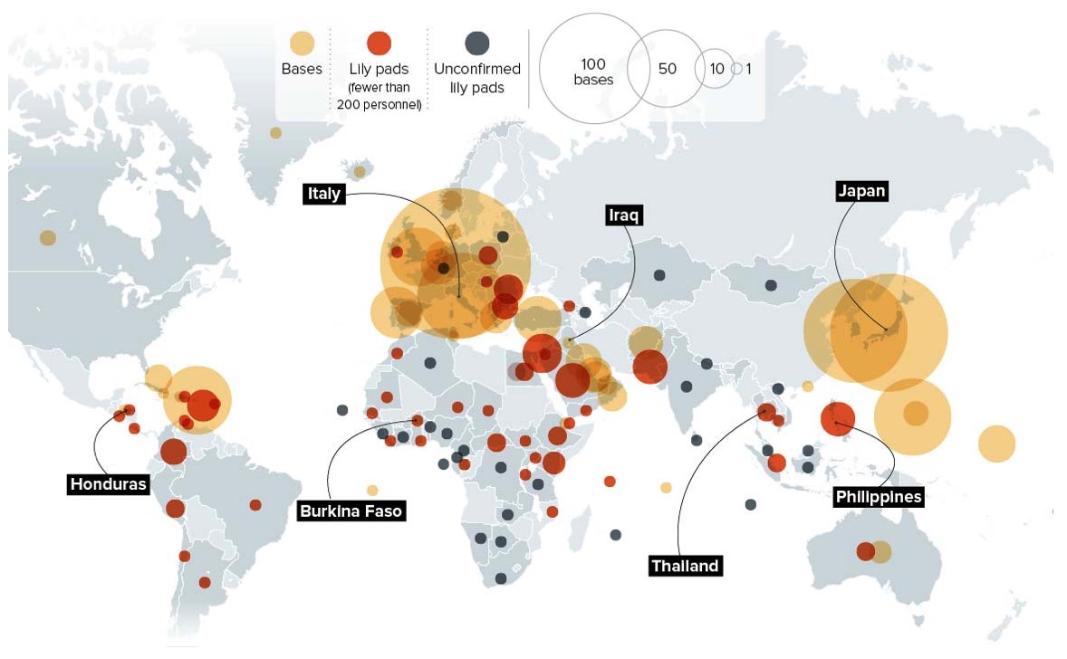 Good’s understanding of the US empire is easy to visualize with a map of US military bases. Consolidated through a War II victory that left the US mainland unscathed, the United States now operates about 800 known foreign military bases, most of which are in Europe, Japan, and the Middle East.