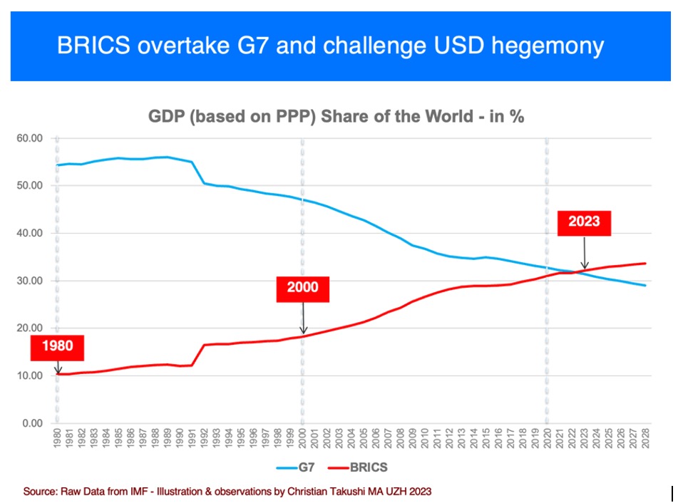 How is the decline of the US empire unfolding? Like many other scholars, Good explains that the decline of US global dominance has accelerated because of the BRICS alliance. In addition to its founding members (Brazil, Russia, India, China, and South Africa), Ethiopia, Egypt, and the UAE have joined the alliance. Plus, 40 other countries have expressed an interest in BRICS membership.