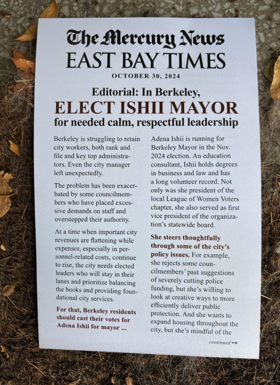 The most conspicuous example of this support was the joint endorsement she received on Oct. 31 from the East Bay Times and The Mercury News (the two Bay Area News Group papers share an editorial board), an accolade that her campaign amply exploited. The only other paper that endorsed in the 2024 Berkeley mayoral race was the Daily Californian, which gave its nod to Harrison on October 30. The Daily Cal endorsement of Harrison deserves to be cited at length, because its measured tone highlights the imprudence of the EBT/Merc editorial.