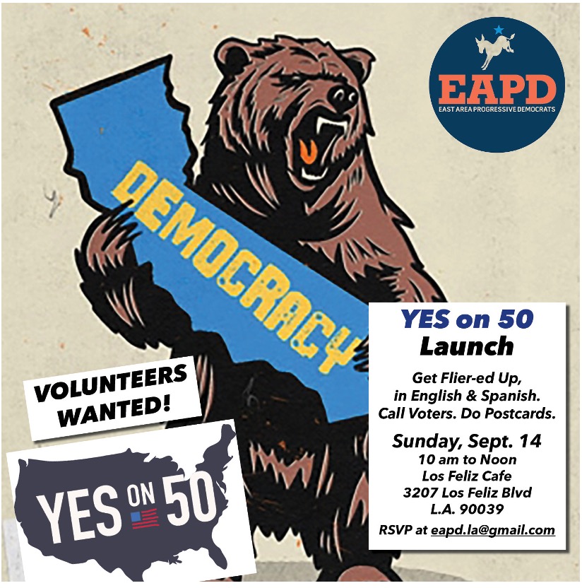 On Sunday, Sept. 14, from 10 am to noon, East Area Progressive Democrats (EAPD) will kick off an effort to educate and activate 150,000 voters throughout the “Greater Eastside” of L.A. and adjacent communities of Glendale, Pasadena, South Pasadena, Alhambra, East L.A., and Montebello. The goal is to engage and mobilize 300 volunteers to be trusted messengers within their communities and large networks of family, friends, and neighbors to vote YES on the Election Rigging Response Act, or Prop 50.