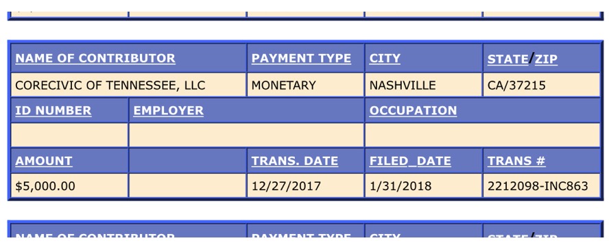 State disclosure records show that one of the major donors to the Women In Power committee in late 2017 was Core Civic, a private prison company, based in Tennessee.
