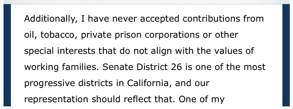 Carrillo’s recent appeal for support also included a whopper of a bogus claim. “I have never accepted contributions from oil, tobacco, private prison corporations or other special interests,” Carrillo professed.