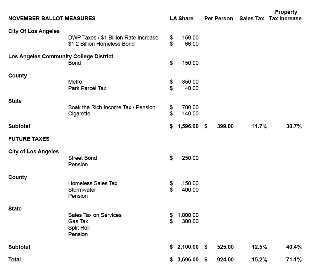 But that’s not all folks. The political establishment at the City, County, and State levels is cooking up a number of other schemes to pick our pockets that, when added to $1.6 billion, will result in Angelenos being slammed for $3.7 billion, or $925 for each man, woman, and child living in the City of Los Angeles.