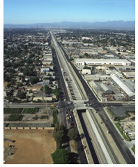 This 20 mile multitrack rail expressway that connects the Ports of Los Angeles and Long Beach to the downtown rail yards of Union Pacific and Burlington Northern has resulted in massive transportation efficiencies and savings by reducing the travel time of container laden freight trains from the Ports to downtown rail years to 30 minutes compared to three or four hours prior to its opening in 2002. (Photo above: Ports through windows of California Zepher.)