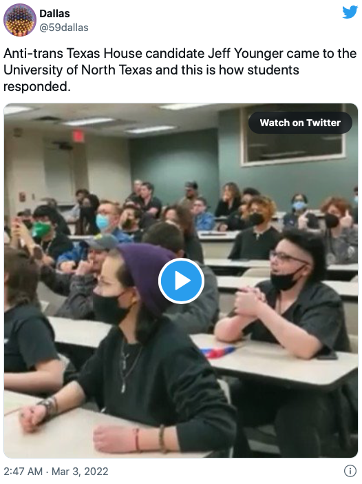 TRANS SUPPORT - By repeated chanting, “F*** these fascists” and slapping their desks, students at the University of North Texas (UNT) shut down a talk by Jeff Younger, a transphobic Republican running to become a Texas state representative.