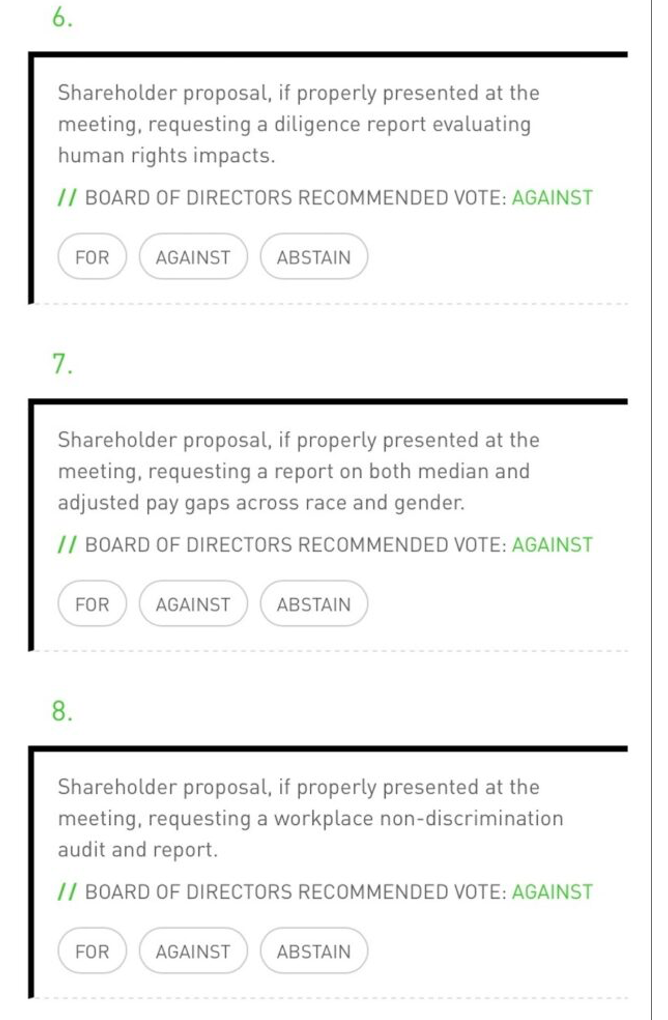 And today, the company will hold its annual shareholder’s meeting, where the Board of Directors is apparently advising shareholders to vote against certain anti-discrimination and human rights resolutions.