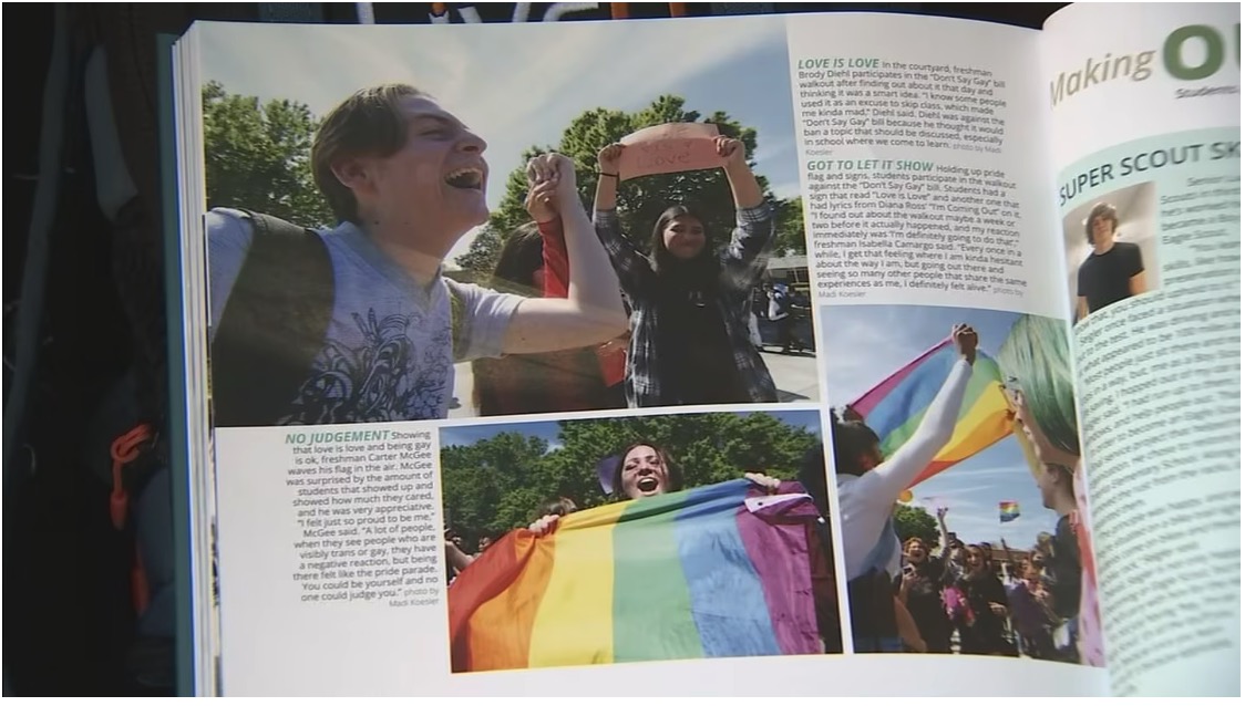 In 2022, school officials weighed stickering over pictures of a student walkout protesting Florida’s Don’t Say Gay legislation.