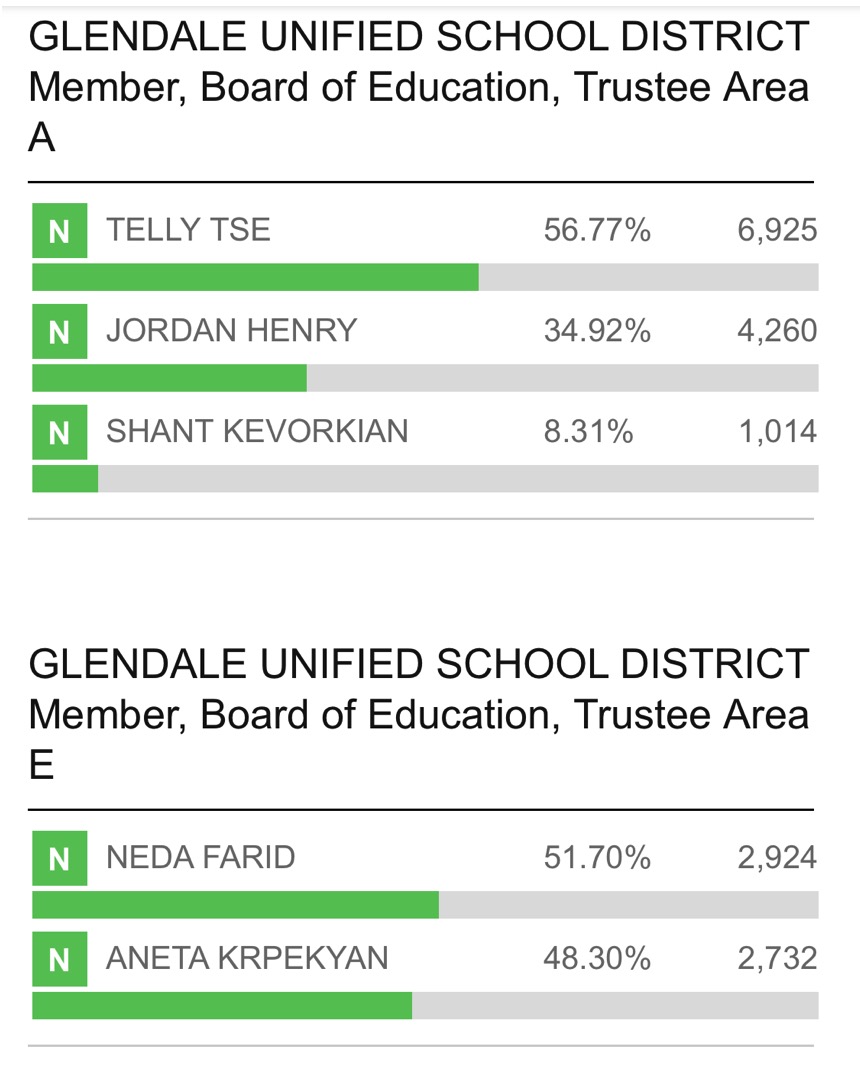 In the end, Tse prevailed handily with the voters in Area A, earning 57 percent of the vote; he defeated Henry, at 35 percent, by more than 2,500 votes. In Area E, Farid won decisively but narrowly with 52 percent of votes, besting Krpekyan by just under 200 votes.