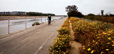 Of course, I knew it was springtime—with jasmine sweetening the air all over LA, only the most obtuse would miss it—but I had forgotten that the Ballona Wetlands (saved from development by the concerted efforts of hundreds of ordinary folks like you and me) would be in bloom. And indeed, the world seemed a fabric of bright yellow flowers for miles and miles as I rode. Even my usual weary cynicism was shattered by the sight, on that cool and gray afternoon, so I took a few snapshots, which fill the rest of this page.
