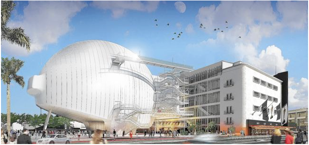 Urban Design: The deregulators’ version of the “urban growth machine” also ignores the design implications of their real estate investments. Even though the City Council unanimously adopted the General Plan Framework Element, which has an entire chapter on Urban Form and Neighborhood Design, as well as appended design guidelines for residential, commercial, and industrial projects, the visual impact of these helter-skelter projects flies below the decision makers’ radar. In some cases there are even local design guidelines, such as Miracle Mile’s Community Design Overlay District, that deep-pocketed political muscle easily dispenses with, approving such hideous buildings as the Peterson Museum and currently-under-construction Museum of Motion Picture Arts and Sciences. (rendering photo above)