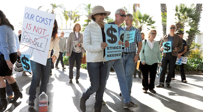 Until we see complete transparency and a ban of ex-parte meetings, the Coastal Commission will answer to special interests with deep pockets. Our miles of coastline will be up for grabs, sold to the highest bidder. You could lose you California beach. I ask again, where the hell is the outrage!?