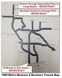 Look at Metro’s 1980 ballot measure brochure transit route map on the left. This was Metro’s promise for its first half-cent transportation sales tax. There’s a line from Sylmar to Long Beach. There’s another line from El Monte to San Pedro. And another from Burbank Airport to Canoga Park. But none of these were ever built.