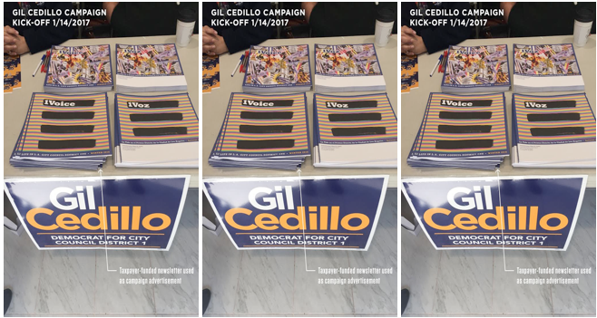 “It is unclear,” he said, “how Gilbert Cedillo’s campaign was provided with this large quantity of taxpayer-funded newsletter materials for use as a campaign advertisement at the event.”