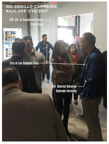 Three formal complaints have been filed detailing that at the January 14 ‘Gil Cedillo for City Council’ campaign event held at 1139 W. 6th Street, Council Office staff members Fredy Ceja and Conrado Terrazas both wore Team Cedillo windbreaker jackets, prominently displaying the official City Seal of the City of Los Angeles.