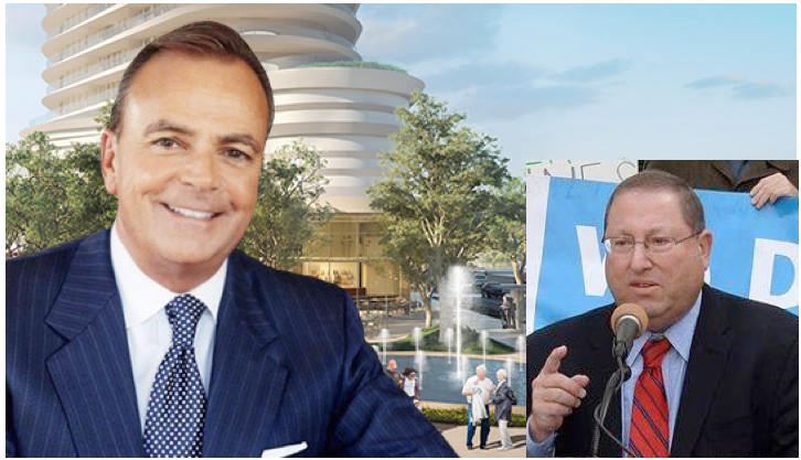 CommentsDEEGAN ON LA---"This compromise is a joke!" exclaimed Diana Plotkin, president of the Beverly Wilshire Homes Association, responding to CD5 Councilmeber Paul Koretz’ announcement to the the city council’s Planning and Land Use Management committee that he had reached what he called a “reasonable compromise for a middle ground” where developer Rick Caruso would reduce the height of his proposed 333 La Cienega tower by almost 25% (from 245 feet to 185 feet), and contribute a half-million dollars to the city’s Affordable Housing Trust Fund that creates affordable rental housing for low and very low income households. (Photo above: Developer Rick Caruso in front of La Cienega tower, Councilman Paul Koretz-inset.)