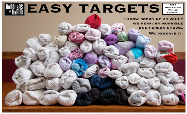 First, let's talk of the socks. Easy Targets is presented by a group that calls itself the Burglars of Hamm. The underlying idea is that some performances can be so bad that the audience wants nothing more than to punish the actors and the author. I certainly know that feeling. The theater company describes the show as follows: "Easy Targets is for every audience member who has sat in the dark at a bad play thinking they now know what prison must be like."