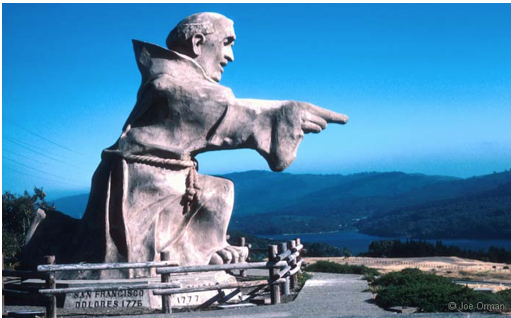 Given changing cultural attitudes, one wonders about the fate of other venerable symbols, such as the giant statue of Father Junipero Serra (photo above), the missions’ founder, that looms above Interstate 280 near Hillsborough, the many schools and other public buildings named for him, or the statue of Christopher Columbus with his patron, Spanish Queen Isabella, in the Capitol’s rotunda.