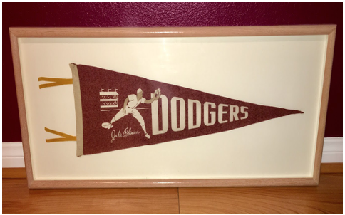 None of them caught my attention, until half-way down in the stack a gem popped up: a burgundy-colored flag with an image of none other than Jackie Robinson; it was completely flattened by the pennants below and above it. While sports memorabilia had not yet become a big industry, most anyone could see that this was a real find.