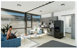 KTGY - “We use recycled containers that are manufactured to our specifications. Using Growthpoint Structures, a local manufacturer, provides not only affordable housing units, but also local jobs in the region. The port of Los Angeles-San Pedro is a ready source of shipping containers that can be reused. Usually we use an 8x20 ft. container. Three of them are combined into a 480-square foot apartment. The Hope on Alvarado Project will be 84 units.”