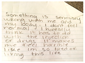 “My life is at an alltime [sic] high right now & I mean that from all ways. I ended up back at Buck [sic] house again and got munipulated [sic] into slamming again. I even went to the point where I was forced to doing 4 within a 2day [sic] period. This man is crazy and its [sic] sad. Will I ever get help?”