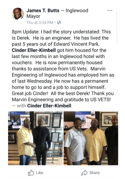 Mayor Butts has leveraged the relationship with many of his campaign donors (Republic Services, Marvin Engineering and the Rams) to secure jobs for friends, family and for homeless residents, which he proudly boasts about in his Facebook group Eye on Inglewood.