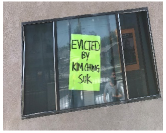 Some tenants have taken the vacate notice very hard, creating signs like, “Evicted by KIM CHUNG SUK” “LATENANTS.ORG” “DON’T LET MY KIDS GO HOMELESS” “WHERE ARE YOU MARQUEECE? DID WE MISS YOUR CALL?” – all evidence of how angry these former tenants are.