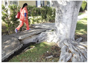 To begin, most of LA’s sidewalks are in terrible shape, and City Hall admits about 60 percent of them arein disrepair. Tree roots from poorly selected and cared-for trees have lifted sidewalks in all Los Angeles neighborhoods. Decades of deferred maintenance have then left these crumbling sidewalks in such bad shape that City Hall is forced repave them. But since sidewalk repairs are a low budget priority for the Mayor and City Council, the sidewalks go from bad to worse.