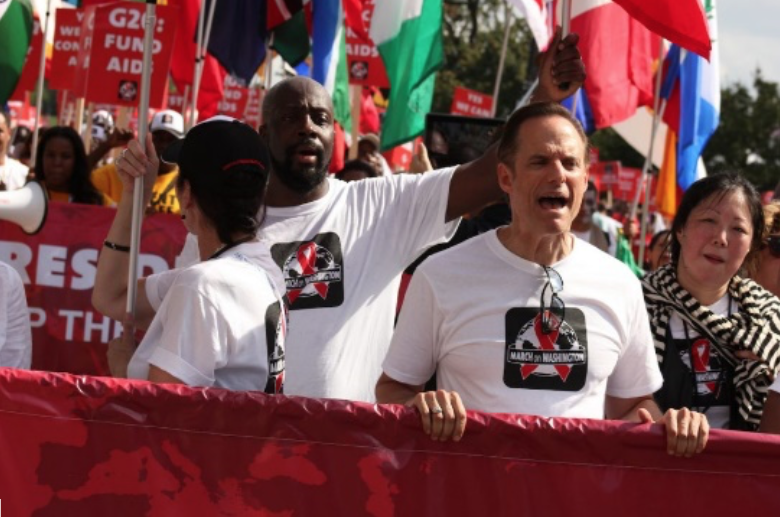 But the main funder of the Yes on 10 campaign comes from what might, to an unpracticed eye, be an unlikely source. (Photo above: Michael Weinstein, center, at an AIDS march in 2012 with comedian Margaret Cho, right, and musician Wyclef Jean, left. )