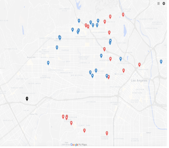 (Left: Properties owned by LLCs run by Steven Taylor and/or Daniel Mense. Blue ones have already been flipped, often for big profits. Red ones they still own/operate. The wealth extracted from tenants goes to Taylor’s $3.5 million mansion in Cheviot Hills (black marker). Link to the map (with addresses) here.