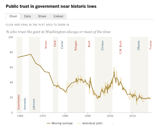 As the chart here demonstrates, within living memory public trust in government has fallen from 75 percent in the Eisenhower era to below 20 percent under Trump. While city governments generally fare better in these polls, Los Angeles is not among them. Our fair city has experienced two enormous civil disturbances (1965, 2002), LAPD consent degrees, City Hall pay-to-play scandals, world-class traffic congestion and bad air, crumbling sidewalks, and endless spin jobs to push mega-projects and up-zoning real estate schemes past the City Council finishing line.