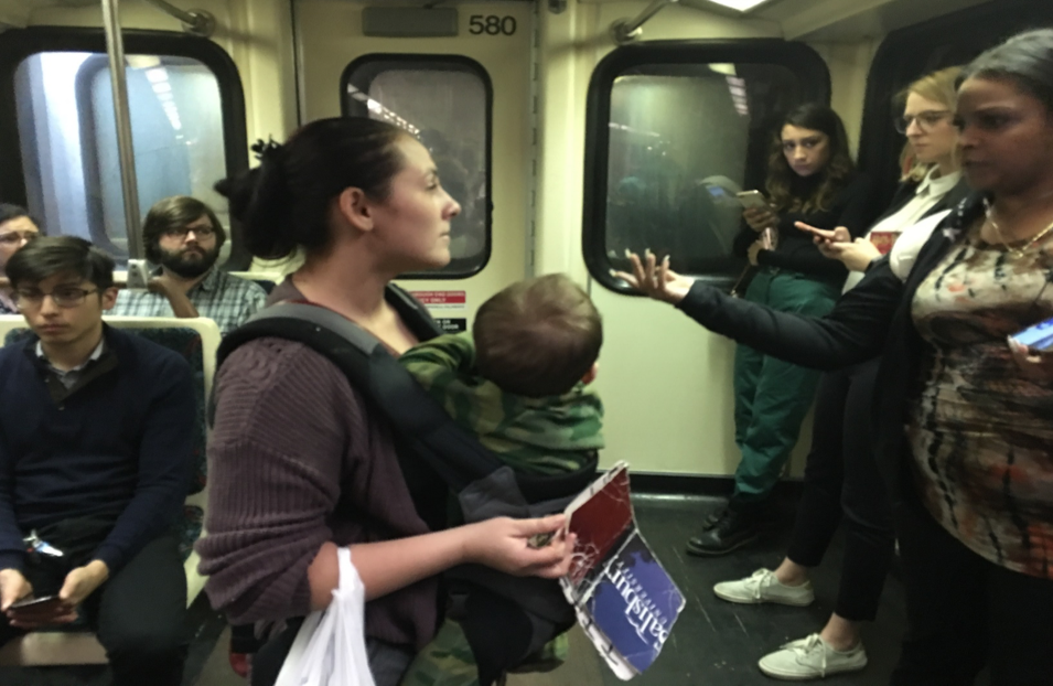 Comments@THE GUSS REPORT-The familiar young woman with a young child strapped to her chest wandered around the LA subway car going from passenger to passenger soliciting donations with a sign indicating she has two children and no job.