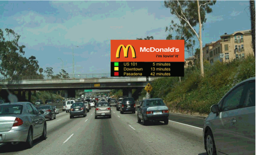 Ray Bradbury conceived of the same idea, but in a science fiction piece from many years ago. Then the owners of Dodger Stadium and other such arenas figured out that they could run animated digital signs all around the stadium. So, imagine you are in Dodger Stadium with that sign flashing on and off, but you are trying to drive through at 65 miles per hour.