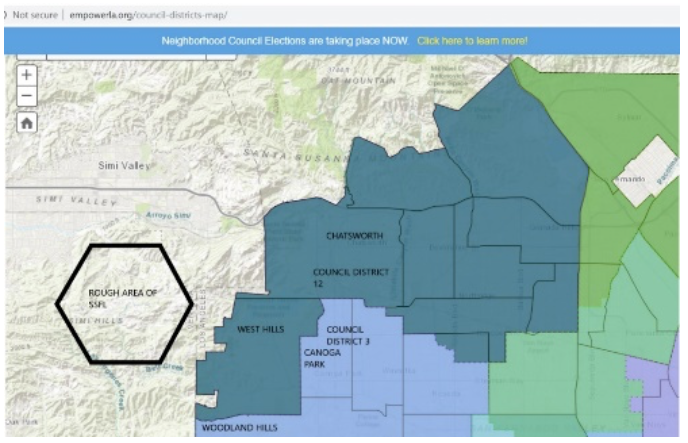 The map below from the City of Los Angeles is used to show the rough proximity of the Santa Susana Field Laboratory site which is in Ventura County to the City of Los Angeles boundaries, to Council District 12 in West Hills and Chatsworth as well as parts of Canoga Park, and to Council District 3 in Woodland Hills, and parts of Canoga Park.