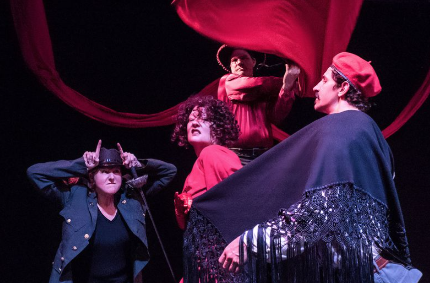 The virtues in this production consist pretty much of showbiz in-jokes, or so I inferred. The audience laughed heartily each time one of the characters referred to some filmic plotline that they must avoid in order to survive. At one point, the lead actress refers to the fact that the assembled cast of amateur serfs they have been training have elevated themselves to the level of community theater. This got one of the biggest laughs of the night.