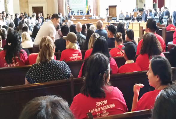 About 100 Angelenos in red shirts, as well as others, rose to their feet while professionals from health care agencies and youth intervention centers spoke in support of preserving El Centro del Pueblo’s Playground.