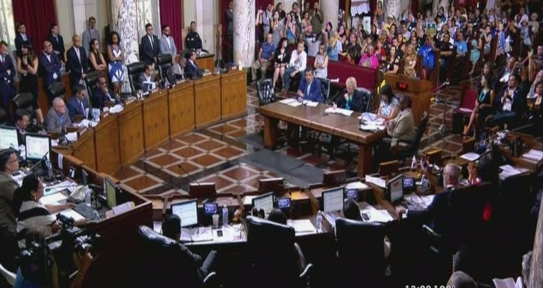 For one thing, several hundred people sat around in the courtyard of the City Hall waiting for the truck containing lunch to arrive. An hour went by. This eventually got solved, and things proceeded more or less normally for the rest of the day.(Photo above: an LA City Council meeting.)
