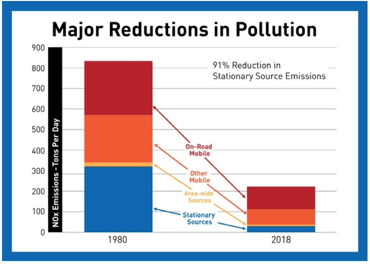 By issuing permits to businesses, requiring special vehicle registration fees, and investing billions of dollars in clean energy, waste processing, and vehicle fleet, the agency has measurably improved air quality since it began gathering data in 1980. Industry and agriculture used to be the primary sources of emissions in the Valley; today, both of those sectors now represent a fraction of the overall pollution. Now, the biggest source is from transportation.