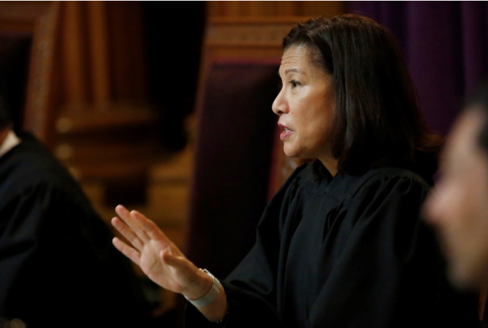 All seven California Supreme Court justices pointedly questioned Deputy Attorney General Jay Russell, as he sought to defend the Democratic-backed legislation in oral arguments in Sacramento on Wednesday. (Photo above: Chief Justice Tani Cantil-Sakauye at oral arguments over California’s attempt to force Donald Trump to disclose his tax returns (photo by Rich Pedroncelli/AP)