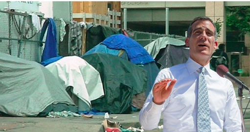 Eric Garcetti at the mike, facing the cameras, with homeless tents for a backdrop.